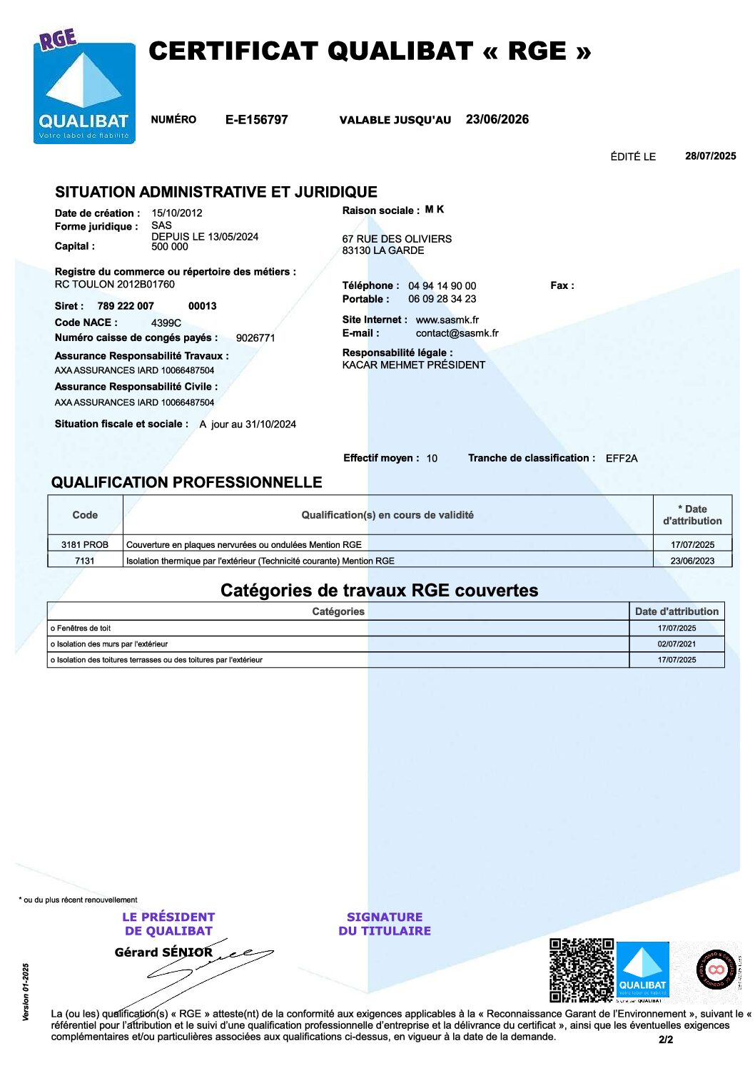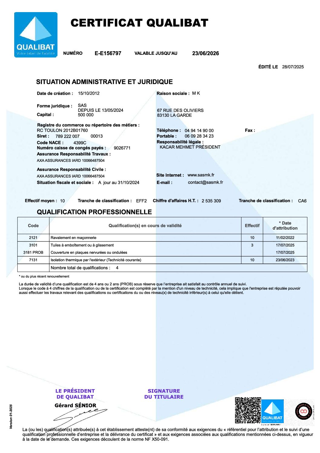 Le certificat QUALIBAT est une reconnaissance du savoir-faire de l’entreprise …en matière de façade ou de toitures suivant la Qualibat obtenu… cela prend en compte les chantiers que l’on a réalisé avec les avis de nos clients sur la prestation , le prix …. Cela prend aussi en compte l’ancienneté , la qualification et et l’expertise de notre personnel. Ils vérifient également la stabilité financière et comptable de la société , les moyens matériels de l’entreprise….