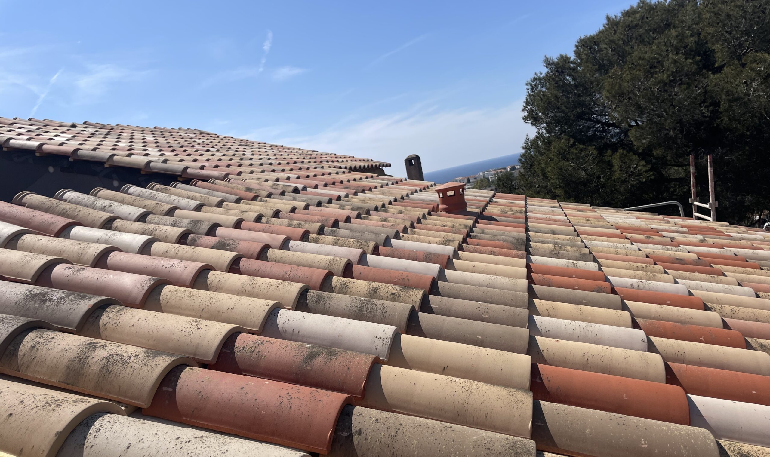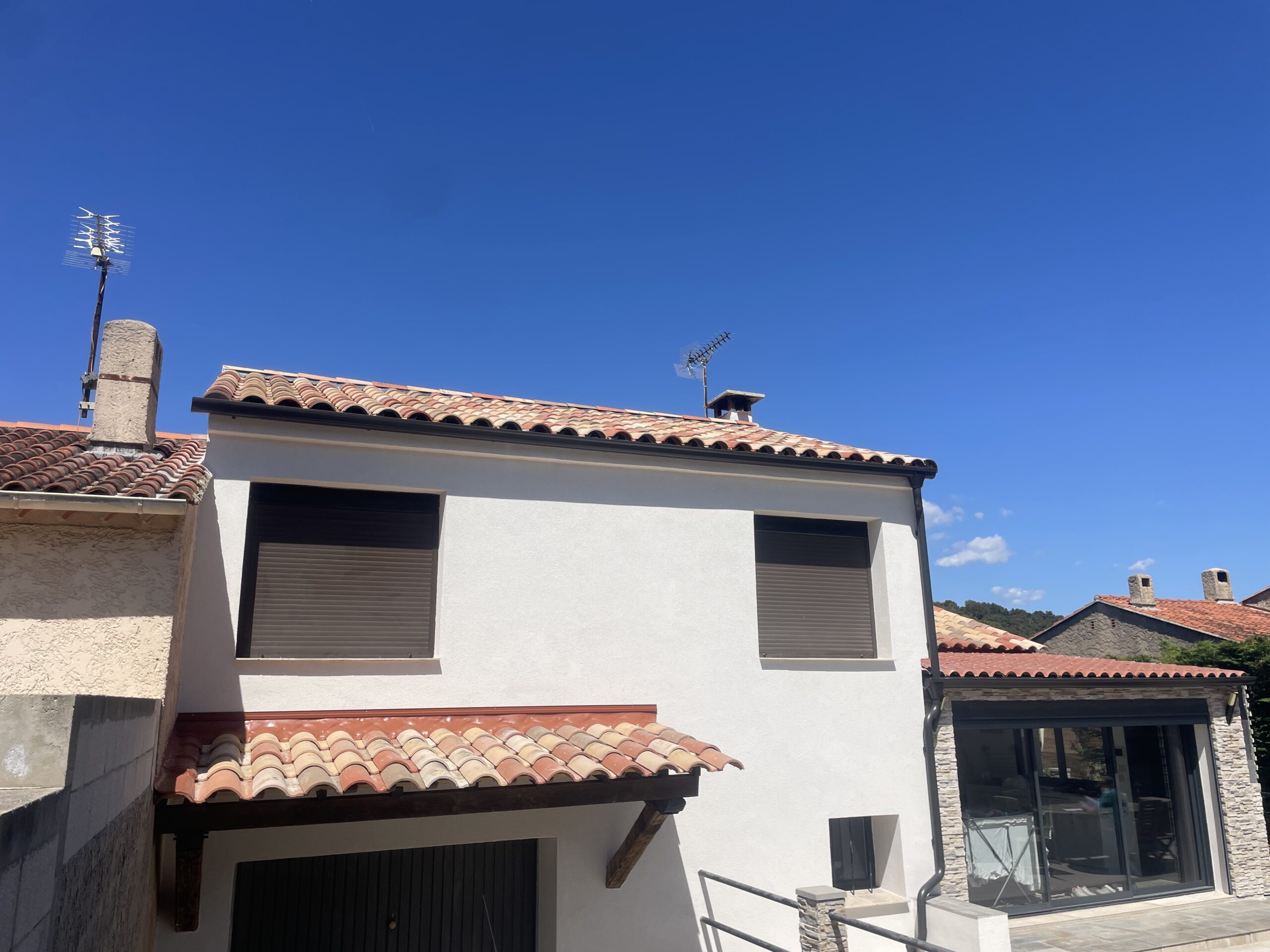 • TOITURE : Dépose et évacuation de l’ancienne couverture . Fourniture et pose d’un écran sous-toiture pour protéger les combles de la poussière et des infiltrations d’eau et pour limiter le soulèvement des tuiles par vent fort. Fixation de nouveaux liteaux traités autoclaves pour recevoir la nouvelle couverture. Fourniture et pose de tuiles Type « Galléane Authentique » de chez MONIER . Installation d’un closoir ventilé en aluminium sur le faîtage . Fourniture et pose de gouttières en aluminium laqué sur mesure Couleur ARDOISE.